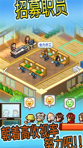开罗动画工作室物语游戏是一款由开罗公司设计制作的模拟经营类手游,游戏采用复古的像素画风,操作简单易控制,操作简单,容易控制,玩家需要通过招募更多的员工、加快动画制作的过程、提升动画的品质来制作出一部部大受欢迎的动漫作品,让公司更好的发展,从最开始的招募员工到宣传以及制作动漫汲取经验等都需要我们不停的努力,玩家可以通过赚取金币不断拓展自己的经营规模,甚至可能成为下一部动画名着的导演,欢迎广玩家前来下载体验!