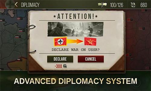 在你的细心指导下,你的国家可以在二战中以军事力量、外交和经济来统治对手。使你能够实现成为世界领导者的雄心,并使你的国家成为超级大国。以任何你想要的方式改写历史!让历史在你的游戏中不留遗憾。另外在战略与战术2手机版游戏中还设定了各种兵种,从机动步兵到大炮,从海军到空军!每个人都可以在战场上发挥作用,战场也可以跨越从欧洲到亚洲及其他地区的任意数量的领土。你可以带领你的国家走向伟大!
