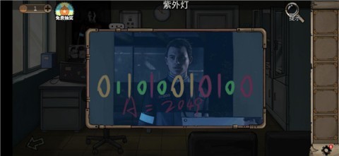 2、进入008号病房,获取紫外线灯,并照射海报得到提示A=2049;