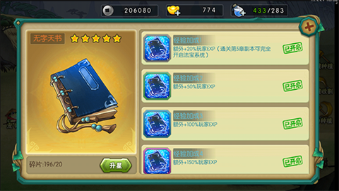 无字天书是玩家修炼路上的宝贵资料,能够为玩家提供额外的经验值。在战斗或完成任务后,使用无字天书可以快速提升等级,加快角色的成长速度。
