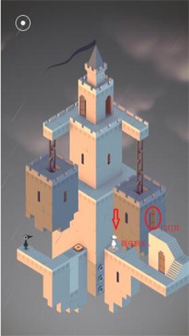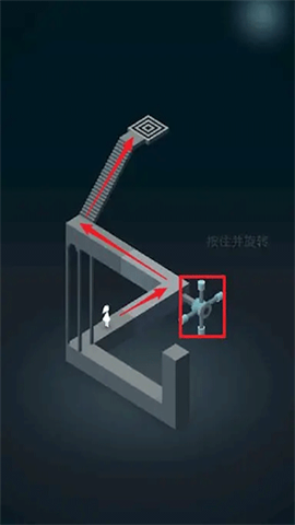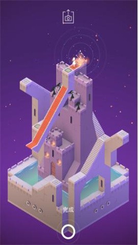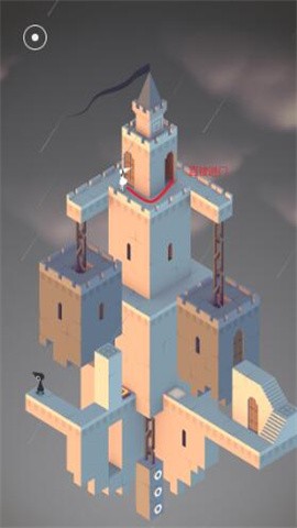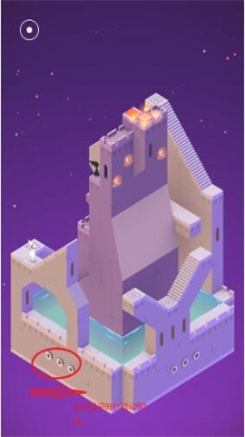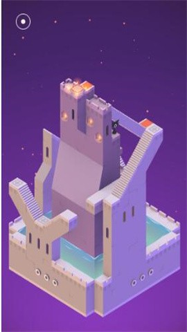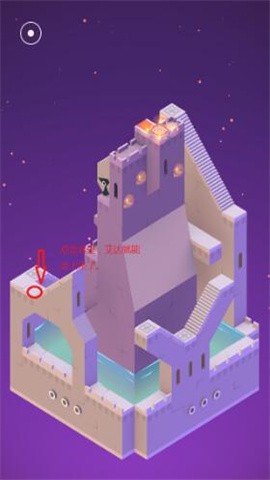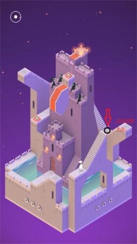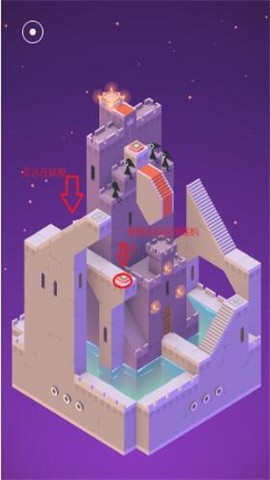 8、在出现的黑色场景中与蓝色精灵互动(此场景犹如几何神功,令人不禁联想到如来神掌,令人忍俊不禁)。直接走入洞口,便会出现在紫色城堡处。这里常常需要各种旋转操作。首先让艾达走到制高点。