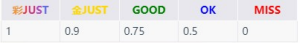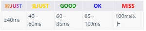 4、游戏中音符判定分为5种,包括彩JUST、金JUST、GOOD、OK和MISS。打出MISS时Combo会中断,五种判定对应不同的误差范围。