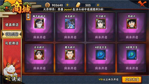 特权商店:玩家可以在特权商店购买相应的忍者碎片,但特权商店需要VIP等级10才能开启。通过充值,玩家可以获得一些特权和金币,从而快速获取所需的忍者碎片。