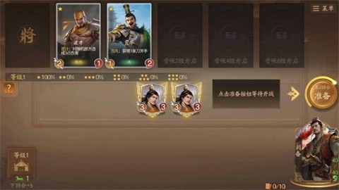 2、招募阶段:玩家调整阵容,招募、上阵、遣散武将,刷新营帐。布阵后点击准备,倒计时结束后进入战斗阶段。