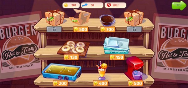 2、强大的道具可以帮助玩家管理时间,有机食物可以制作更健康的菜肴,不粘锅可以确保食物不会烧焦。