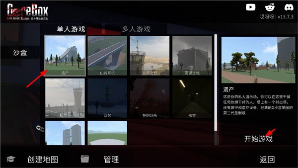 2、选择单人模式(多人模式暂不支持),在场景列表中挑选一个地图,推荐选择遗产地图,也可使用自定义地图,确认后开始游戏;