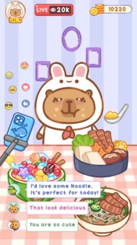 美食大师现场吃播是一款休闲商业模拟游戏。这款可爱的治愈饮食游戏的艺术风格非常甜美。使用游戏内的直播来分享你的烹饪冒险,品尝各种美味的菜肴,成为最好的美食明星!将珍珠奶茶与有嚼劲的珍珠奶茶、奶油配料和彩色果冻混合并摇匀。做美味的披萨:涂上酱汁,撒上奶酪,再加上无数的配料。让我们一起体验美食大师的现场吃播!