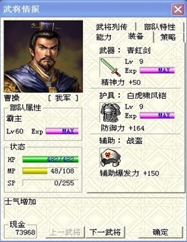 三国志曹操传游戏玩法丰富,6个职业、8个战斗和多种技能,大大增加了游戏的策略性。游戏有大量精心设计的关卡,每个关卡都需要玩家逐步通关。玩家需要在一个又一个战场上满足特定的胜利条件。游戏战场采用升级故事的形式,每个关卡都有自己的故事、背景和敌人。