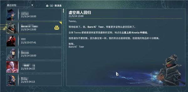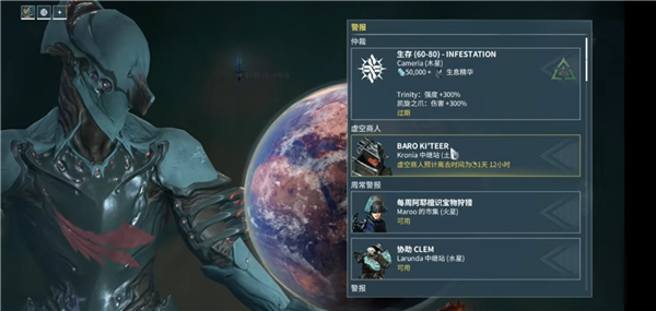 2、除了通过地图定位,玩家还可以用多种方法找到虚空商人。系统会在他到来前通过邮件告知玩家上线时间和中继站名称,部分邮件还能一键传送;游戏内大地图上,中继站中央广场会有商人图标,支持自动导航;警报界面也会实时更新他的位置,让玩家不错过交易机会。