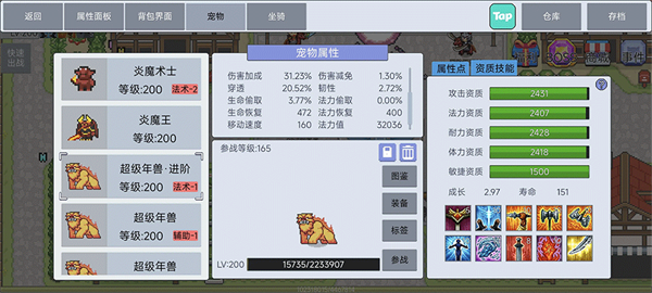宠物技能等级上限提升至15级,并同步优化了部分宠物的技能成长曲线。
