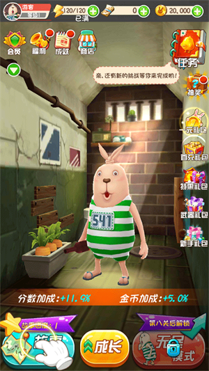 逃亡兔完整版游戏深度还原了动画中的经典场景和人物,让玩家仿佛置身于动画世界。收集金币后,玩家可以升级角色的技能,如跳跃高度、速度和特殊能力,提高逃生成功率。随时随地和兔子一起体验越狱的乐趣,挑战极限,享受越狱的乐趣!