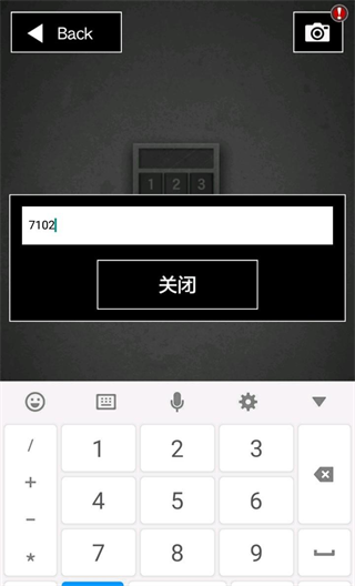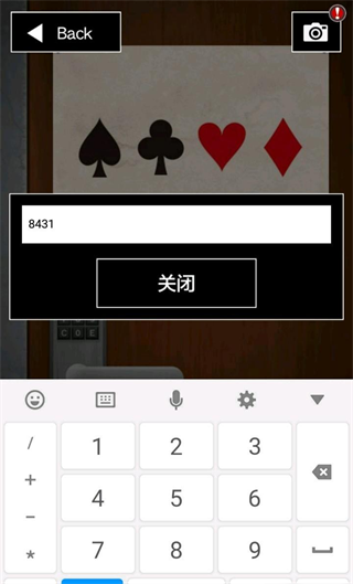 5、回到2号房间按下按钮,再进入3号房间按下按钮,调查纸张和时钟获取线索。在密码门前,根据形状顺序输入密码【8431】,其中4是随意猜测的,没想到竟然蒙对了。进入里面的房间后,获得地下室钥匙。