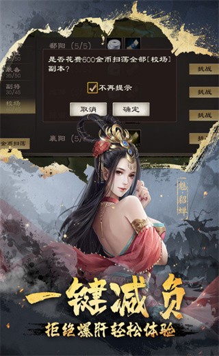 2、过关斩将:分为普通和困难两大难度,合计30个不同关卡,击败守关将领后可获得奖励,通关普通难度后将开启困难模式,每天可重置一次关卡进度。