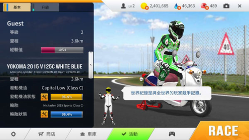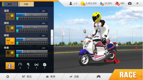 1、升级摩托车即可提高速度、加速度、转弯、刹车性能。