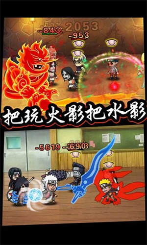1、游戏将火影中的人物全部Q版的重现于游戏中,玩家只需要将他们收集到手,就可以组成属于玩家自己的最强队伍!