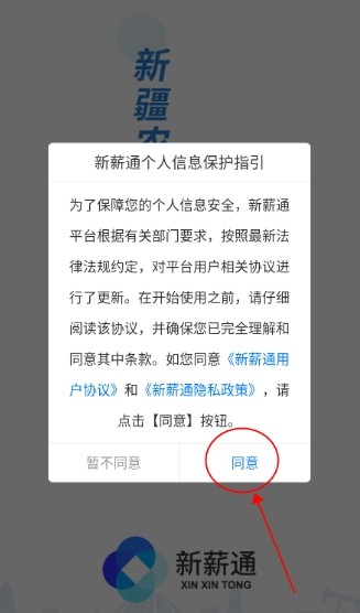 1、下载并安装新薪通工人端后,打开应用,会看到新薪通个人信息保护指引弹出。