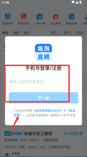 1、前往下载鱼泡网招工人APP,完成注册并登录,进入主界面后允许软件获取你的位置信息。