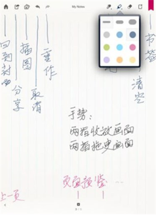 3、在画纸上长按不放,会弹出笔刷选择菜单。免费版本提供三种基础笔刷及六种颜色;此外,马克笔选项中也包含多种粗细与色彩。两种笔触效果各有特色,使用体验不同。完成笔记后,可选择打印或保存。右上角的小标签可用于标记本页为重点内容,便于日后页数增多时快速定位;