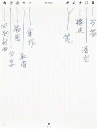 2、双击笔记区域即可新建一个空白页。参考上图注释,顶部功能栏从左至右依次为:返回封面、分享、撤销/重做(上一步与下一步)、画笔、马克笔、橡皮擦、清除整页,以及设置标签;