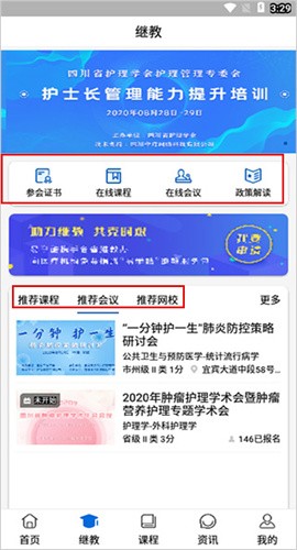 2、主页功能包括在线课程、直播课程、答疑社区、医学会议、学分查询等功能。