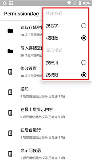 1、打开权限狗app,点击右上角三条水平线的图标,选择应用排序或权限排序;
