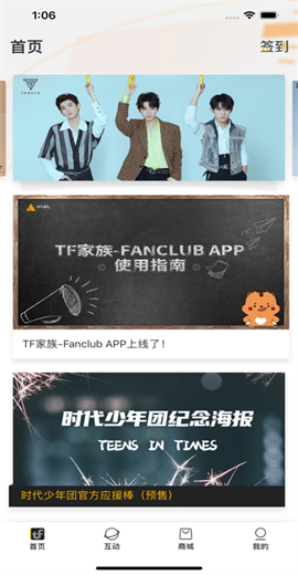 时代峰峻fanclub软件中拥有首页、互动、商城、我的等功能模块,这里有很多模式可以选择,还有全新的玩法可以感受,在这里粉丝们可以更加方便的购买偶像周边,还可以在第一时间最先了解自己爱豆的演出信息和实时动态,开启全新追星体验!