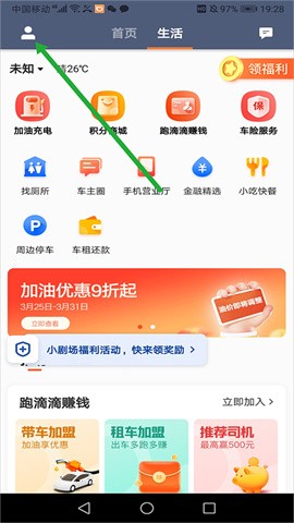 打开app后进入页面,点击左上角头像图标(下图绿色箭头所指)。