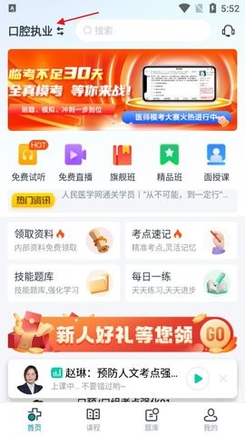 1、打开医学直播课堂人民医学网app,进入首页后点击左上角选择所需科目;
