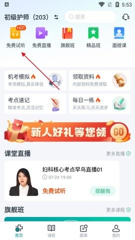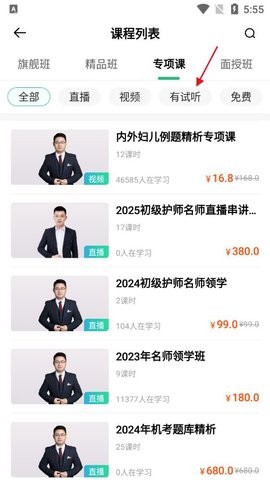 4、也可在首页点击精品班,进入后查找带有试听标识的课程,点击即可直接试听。