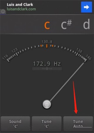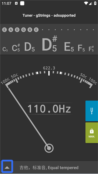 1、启动gStrings调音器应用后,请确认界面右下角的“Auto”按钮处于绿色点亮状态。判断是否已进入“AUTO”模式的方法很简单:对着手机麦克风发出一个声音(比如喊一声),若指针持续来回摆动,说明已成功启用自动检测模式。