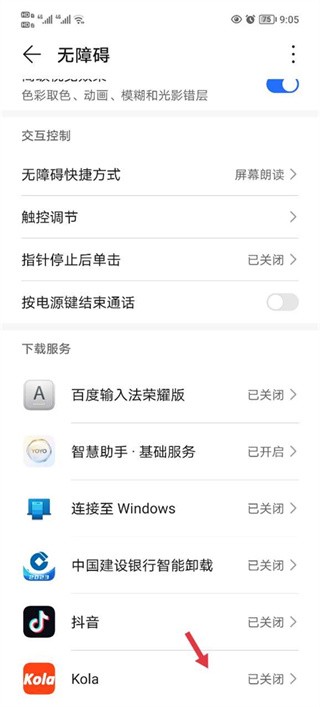2、点击无障碍服务选项,将跳转至系统设置中的无障碍功能页面,找到kola应用并点击进入。