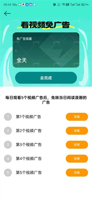 3、点击“全天免广告”进入详情页,按提示观看五个广告,即可获得当日全程无广告的阅读体验。