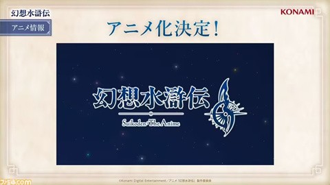 除了新作的推出,科乐美还宣布《幻想水浒传2》将被改编为动画作品,动画制作由科乐美动画(KONAMI animation)负责,制片出品方还包括NBC环球娱乐日本。