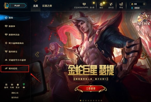 1、打开英雄联盟客户端,进入首页后,选择箭头指示的银龙征程选项进入。