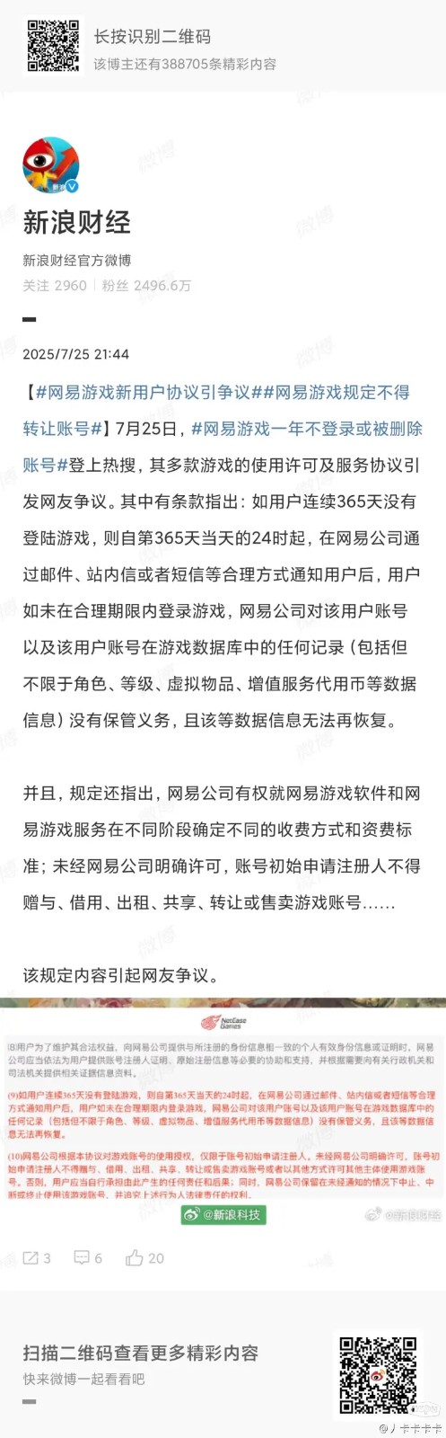 网易游戏新规:一年不登录或将被删除账号,并规定账号不得转让