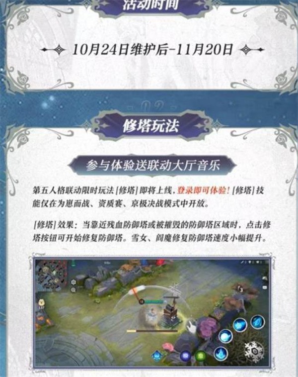 本次联动活动特别推出限时玩法“修塔”,玩家登录游戏后即可参与体验。该玩法将在“为崽而战”、“资质赛”以及“京极决战”等模式中开放。当玩家靠近血量较低或已经被摧毁的防御塔时,点击“修塔”按钮即可开始修复。部分式神,例如雪女和阎魔,还能享受修复速度的加成,为战斗带来更多的策略变化。