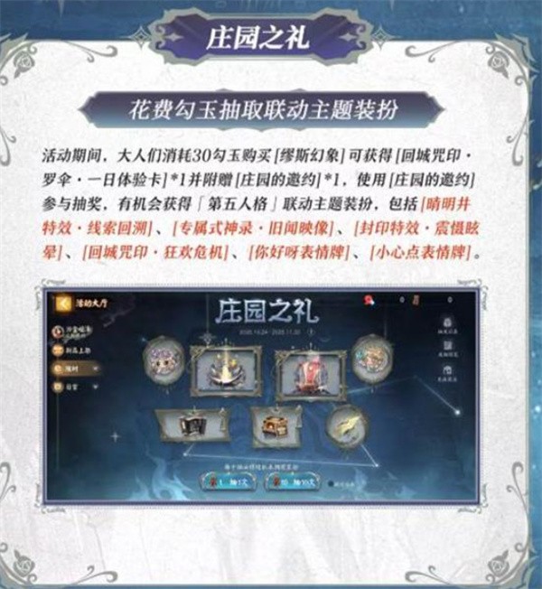 在活动期间,玩家可以消耗30勾玉购买“缪斯幻象”,获得“回城咒印·罗伞”的一日体验卡,并额外获得一次“庄园的邀约”抽奖机会。奖池中包含丰富的《第五人格》联动主题装扮,例如“晴明井特效·线索回溯”、“专属式神录·旧闻映像”、“封印特效·震慑眩晕”以及“回城咒印·狂欢危机”等限定奖励。