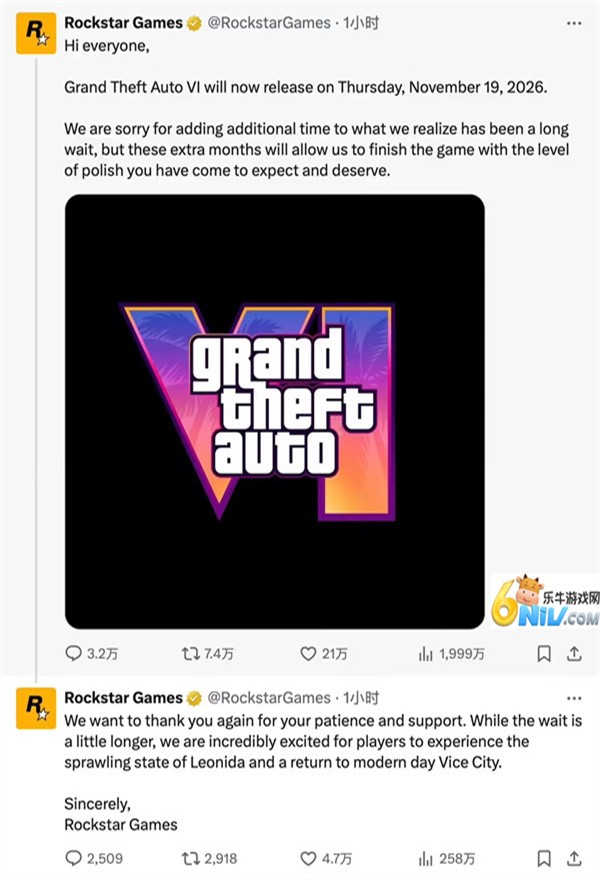 R星官方宣布,《GTA 6》的发售日期推迟至2026年11月19日