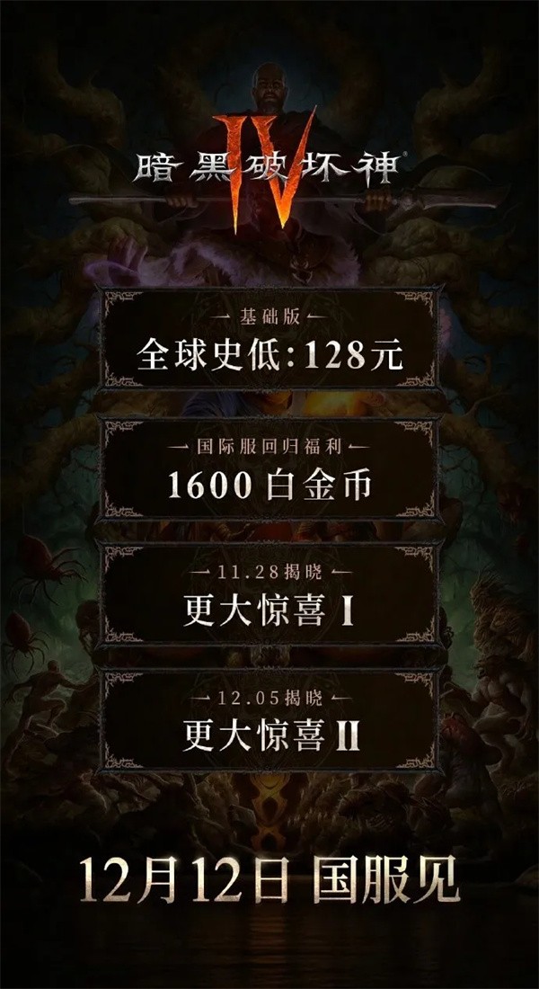 《暗黑破坏神IV》国服将于12月12日上线,推出中国市场专属定价:基础版售价128元,为全球最低。另外国际服回归玩家可获1600白金币福利,降低入门成本。