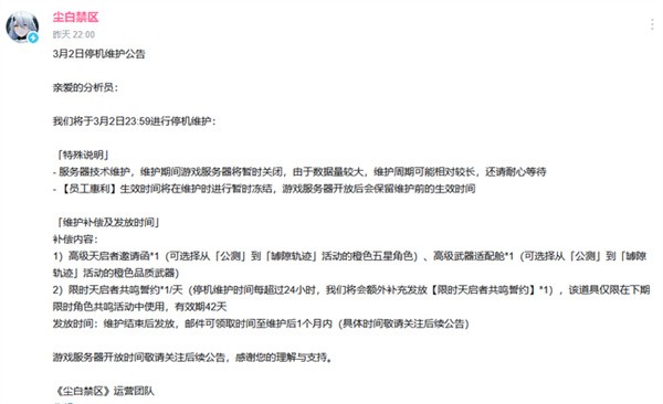 3月2日晚间消息,西山居旗下的二次元射击手游《尘白禁区》官方突发紧急停服维护公告,宣布将于当晚23:59正式关闭服务器。与往常例行版本更新或修复已知漏洞不同,此次公告并未公布具体的恢复运营时间,仅以“涉及数据量庞大,维护耗时可能较长”为由进行解释。这一模糊的表态使得本次停服充满了不确定性,引发了玩家社区的广泛关注与猜测。