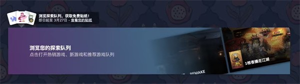值得一提的是,本次活动还同步上线了免费贴纸领取福利,官方表示玩家在即日起至3月27日的促销期内,只要浏览并探索推荐队列,就能无偿获取专属贴纸奖励。