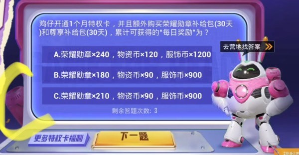 15、鸡仔开通1个月特权卡,并且额外购买荣耀勋章补给包(30天)和尊享补给包(30天),累计可获得每日奖励为?答案: *210*90*900