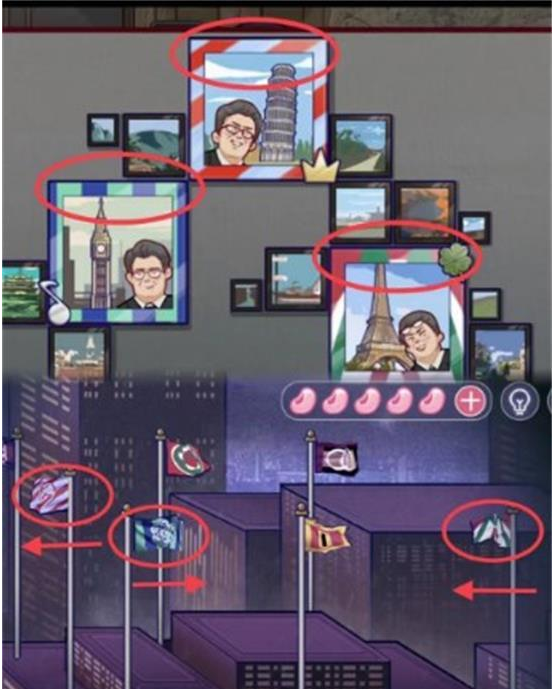5.按钮1:在茶杯底下找到地标式建筑的顺序,按照顺序摆放电脑桌右后方的建筑,得到四叶草箭头按钮。