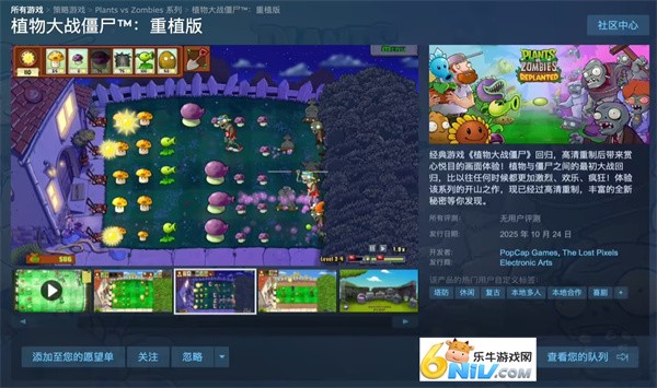 《植物大战僵尸:重植版》现已在Steam平台开启预载,将于10月24日正式发售,国区预购价格为98元10月17日,EA宣布《植物大战僵尸:重植版》已在Steam平台开放预载,游戏大小约为1.1GB,将于10月24日正式上线,Steam国区售价98元,支持简体中文。在10月24日发售前预购游戏,玩家将获得一款复古豌豆射手皮肤。2025-10-17